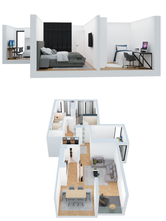 Zona e ditës lidhet në mënyrë harmonike me kuzhinën dhe ballkonin, duke krijuar një ambient modern dhe praktik.